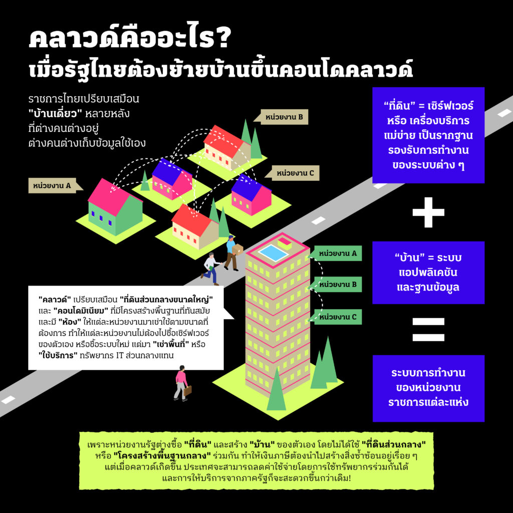 การนำ คลาวด์ เข้ามาใช้ จึงเปรียบเสมือนการสร้าง ‘ที่ดินส่วนกลางขนาดใหญ่’ ซึ่งบนที่ดินนั้น รัฐบาลก็จะสร้าง ‘คอนโดมิเนียม’ หรือ บ้านหลังใหญ่หลังเดียวแทนบ้านเดี่ยว ที่มีโครงสร้างพื้นฐานที่ทันสมัย และมี ‘ห้อง’ ให้แต่ละหน่วยงานมาเช่าใช้ตามขนาดที่ต้องการ แต่ละหน่วยงานทั้งกรมขนส่งฯ หรือกรมการปกครองก็จะไม่ต้องไปซื้อเซิร์ฟเวอร์ของตัวเอง หรือซื้อระบบใหม่ แต่มา ‘เช่าพื้นที่’ หรือ ‘ใช้บริการ’ ทรัพยากร IT ส่วนกลางแทน ซึ่งการตั้งอยู่บนที่ดินเดียวกันหมายถึงการสร้างเครือข่ายที่สามารถเชื่อมโยงข้อมูลหากันระหว่างแต่ละหน่วยงานได้ด้วย การส่งข้อมูลหากันก็จะรวดเร็วทันใจ เพราะหน่วยงานเชื่อมโยงกันทั้งหมด ทำให้ประเทศสามารถลดค่าใช้จ่ายจากการใช้ทรัพยากรร่วมกันได้ และที่สำคัญที่สุด ประชาชนก็ไม่จำเป็นต้องวิ่งถ่ายสำเนาเอกสารเพื่อยื่นขอทำเอกสารราชการอีกต่อไป!