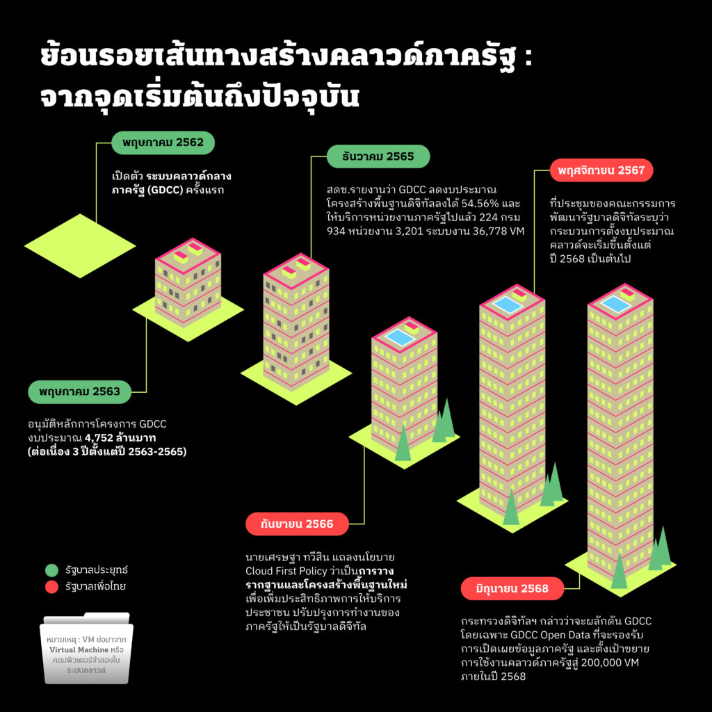 เมื่อพิจารณาในภาพรวมงบประมาณที่ผ่านมา จะเห็นว่านับตั้งแต่การอนุมัติโครงการ GDCC ในยุครัฐบาล พลเอก ประยุทธ์ จันทร์โอชา งบประมาณก้อนแรกที่ถูกใช้ไปกับโครงสร้างพื้นฐานคลาวด์คือ 4,752 ล้านบาท (ต่อเนื่อง 3 ปีตั้งแต่ปี 2563-2565) และลดลงอย่างมากในปี 2566 เหลือเพียง 18 ล้านบาท ก่อนที่จะเพิ่มขึ้นอย่างต่อเนื่องอีกครั้งในรัฐบาลเพื่อไทย (ปี 2567-2569) จนงบประมาณในปี 2569 ซึ่งเป็นงบประมาณสำหรับเพียง 1 ปี กลับมาอยู่ในระดับที่ใกล้เคียงกับงบประมาณเริ่มต้นที่เคยใช้สร้าง GDCC ในช่วง 3 ปีแรก (4,484 ล้านบาท เทียบกับ 4,752 ล้านบาท)