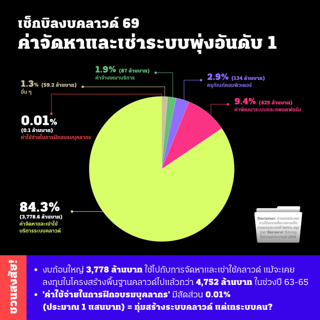 จากข้อมูลการจัดสรรประเภทค่าใช้จ่ายในโครงการคลาวด์ปี 2569 เมื่อนำรายการค่าใช้จ่ายมาแบ่งประเภทใหม่อีกครั้ง จะพบประเด็นที่น่าสนใจอย่างค่าใช้จ่ายประเภท ‘ค่าจัดหาและเช่าใช้บริการระบบคลาวด์‘ ซึ่งเป็นโครงสร้างพื้นฐาน ที่นำโด่งถึง 3,778.6 ล้านบาท คิดเป็นสัดส่วน 84.3% ของงบคลาวด์ทั้งหมด