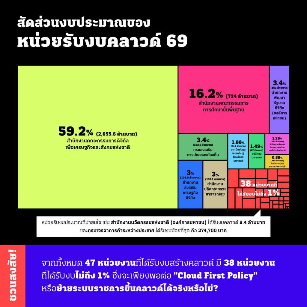 การที่ สดช. ได้รับงบประมาณมากที่สุดนั้นอาจสอดคล้องกับบทบาทหน้าที่ แต่สิ่งที่น่าพิจารณาต่อคือ ในจำนวนนี้มีถึง 38 หน่วยงานที่ได้รับงบไม่ถึง 1% ของงบคลาวด์รวมทั้งหมด หาก สดช. ได้รับเงินก้อนใหญ่เพื่อสร้างและบริหาร ‘คอนโด’ และ สพฐ. ได้รับเงินเพียงพอที่จะย้ายเข้ามาอยู่ในคอนโดแล้ว คำถามคือ หน่วยงานอื่น ๆ ที่ได้รับงบประมาณเพียงเศษเสี้ยว (ไม่ถึง 1%) เหล่านี้ จะมีเงินทุนและทรัพยากรเพียงพอที่จะ ‘รื้อบ้านเก่า’ และ ‘ย้ายเข้าคอนโดใหม่’ ได้อย่างไร? โจทย์ใหญ่ของรัฐบาลในการผลักดันประเด็นนี้ อาจเป็นการวางแผนแผนงานที่ชัดเจนในการสนับสนุนหน่วยงานที่เหลือ เพื่อให้การเปลี่ยนผ่านสู่รัฐบาลดิจิทัลเป็นไปอย่างทั่วถึงและไม่ทิ้งใครไว้ข้างหลัง