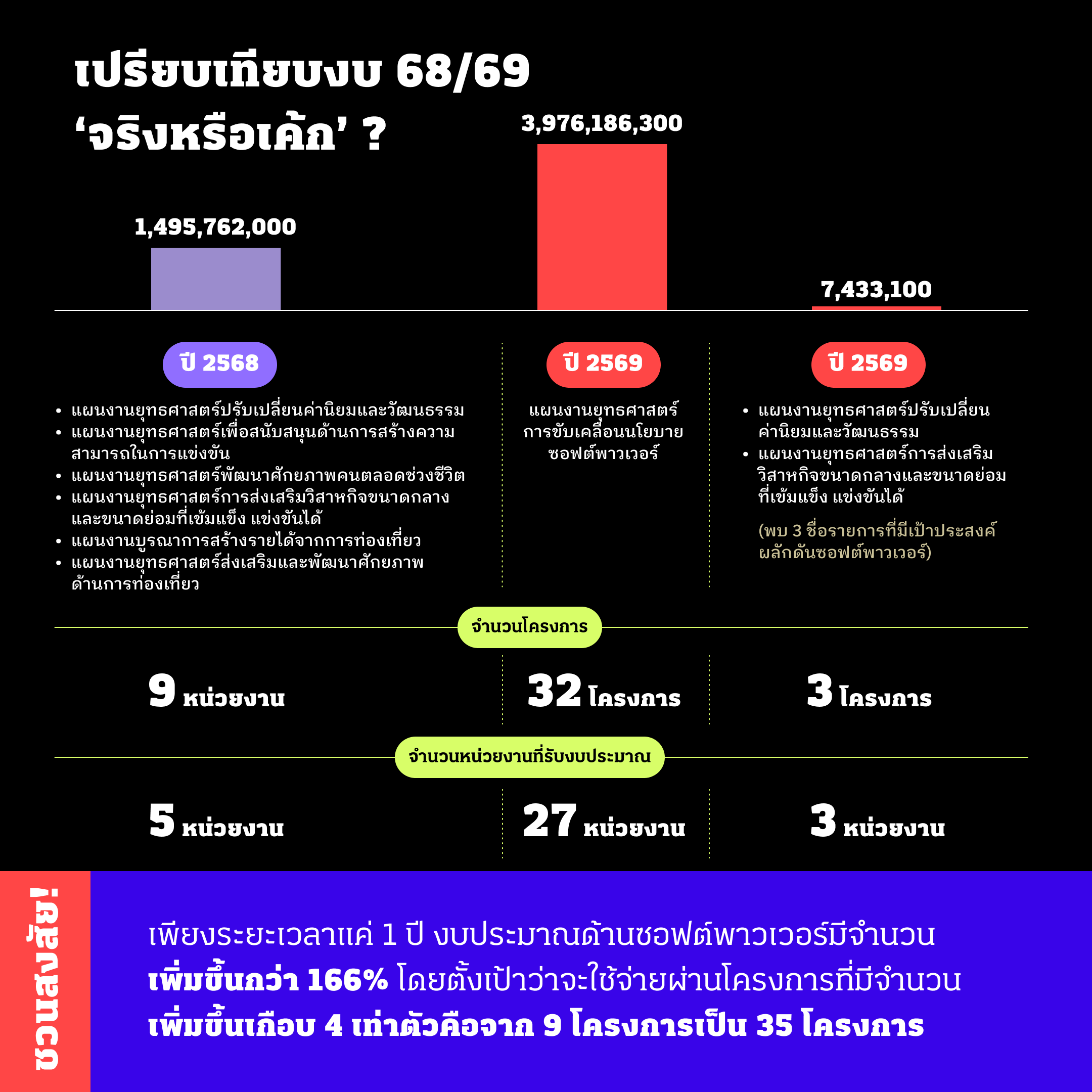 | 2569 | แผนงานยุทธศาสตร์การขับเคลื่อนนโยบายซอฟต์พาวเวอร์ | 3,976,186,300 | 32 โครงการ | 27 หน่วยงาน |