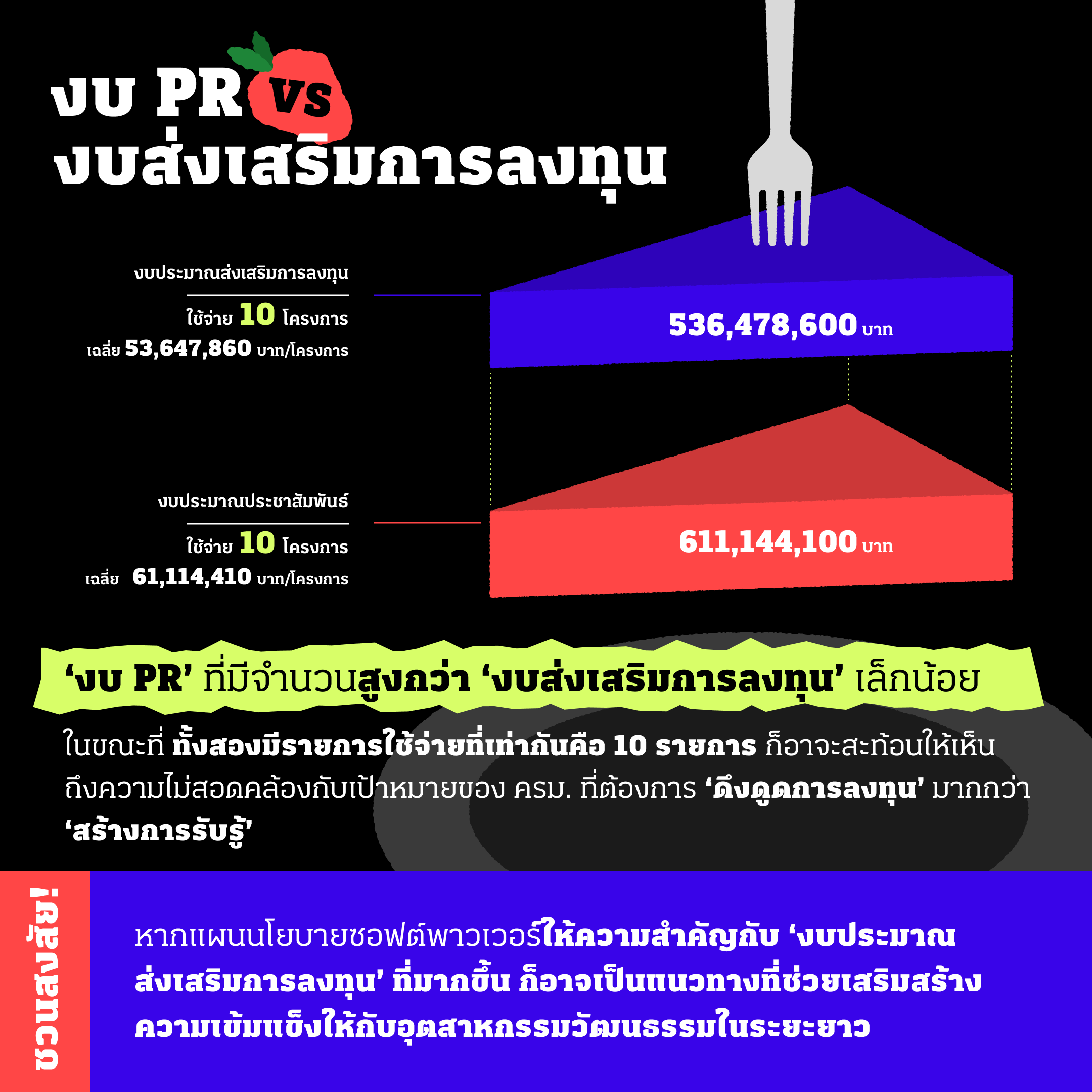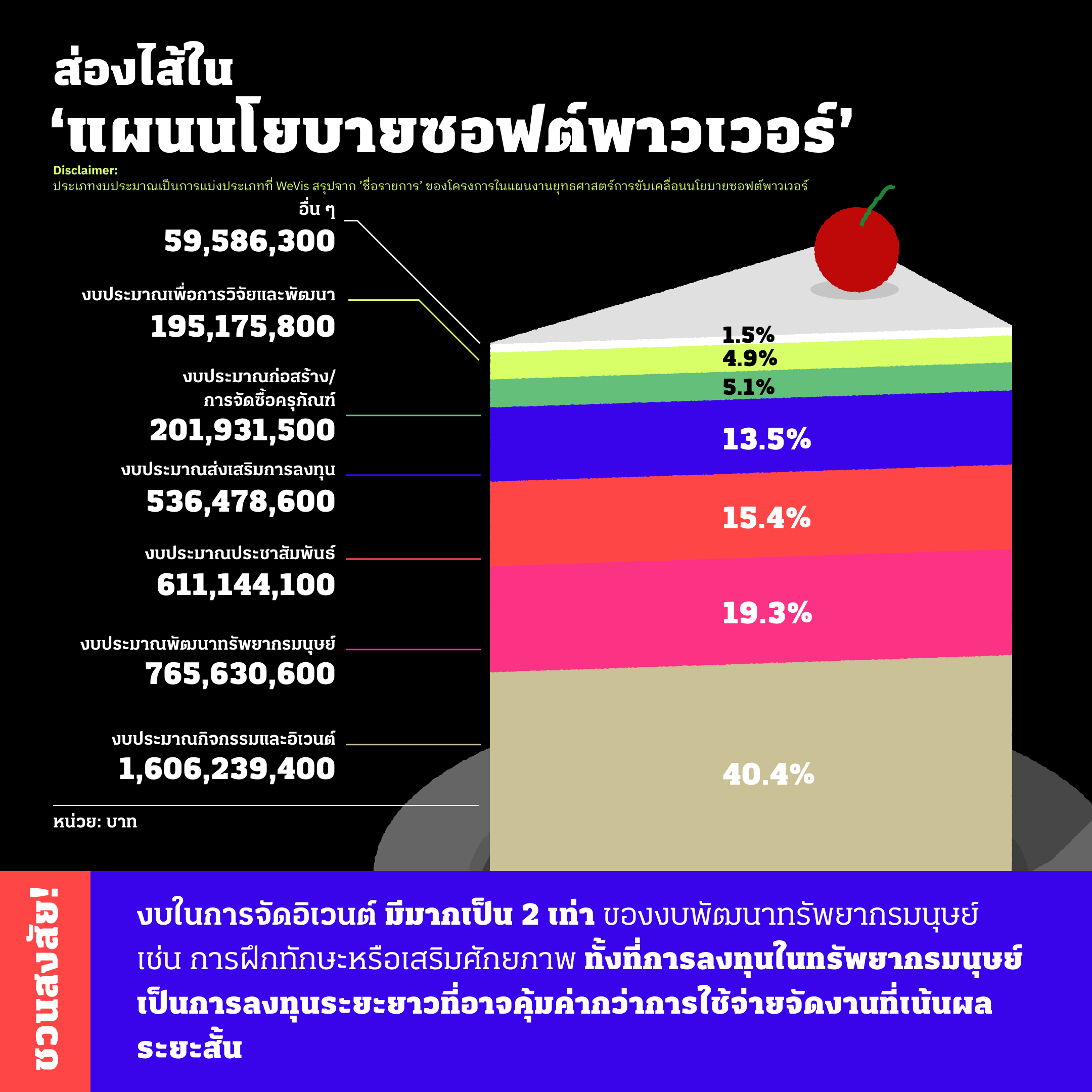 จากสัดส่วนงบประมาณปี 2569 หากนำงบประมาณพัฒนาทรัพยากรมนุษย์ งบประมาณส่งเสริมการลงทุน และงบประมาณเพื่อการวิจัยและพัฒนามารวมกัน ก็ยังคงมีจำนวนน้อยกว่างบที่ใช้จัดกิจกรรมและอิเวนต์ ดูเหมือนว่าการผลักดันเรื่องซอฟต์พาวเวอร์ที่รัฐบาลให้ความสำคัญคือการจัดกิจกรรมและอิเวนต์เป็นหลัก สิ่งเหล่านี้อาจสามารถเรียกเสียงฮือฮาได้ในระยะสั้น แต่อาจไม่ได้ให้ความสนใจเรื่องการวางรากฐานจากการพัฒนาทักษะศักยภาพของคนและอุตสาหกรรมวัฒนธรรมให้มากขึ้นตามเป้าหมายที่วางไว้ ทำให้ยังคงต้องจับตาดูว่าจะทำได้จริงมากน้อยแค่ไหน