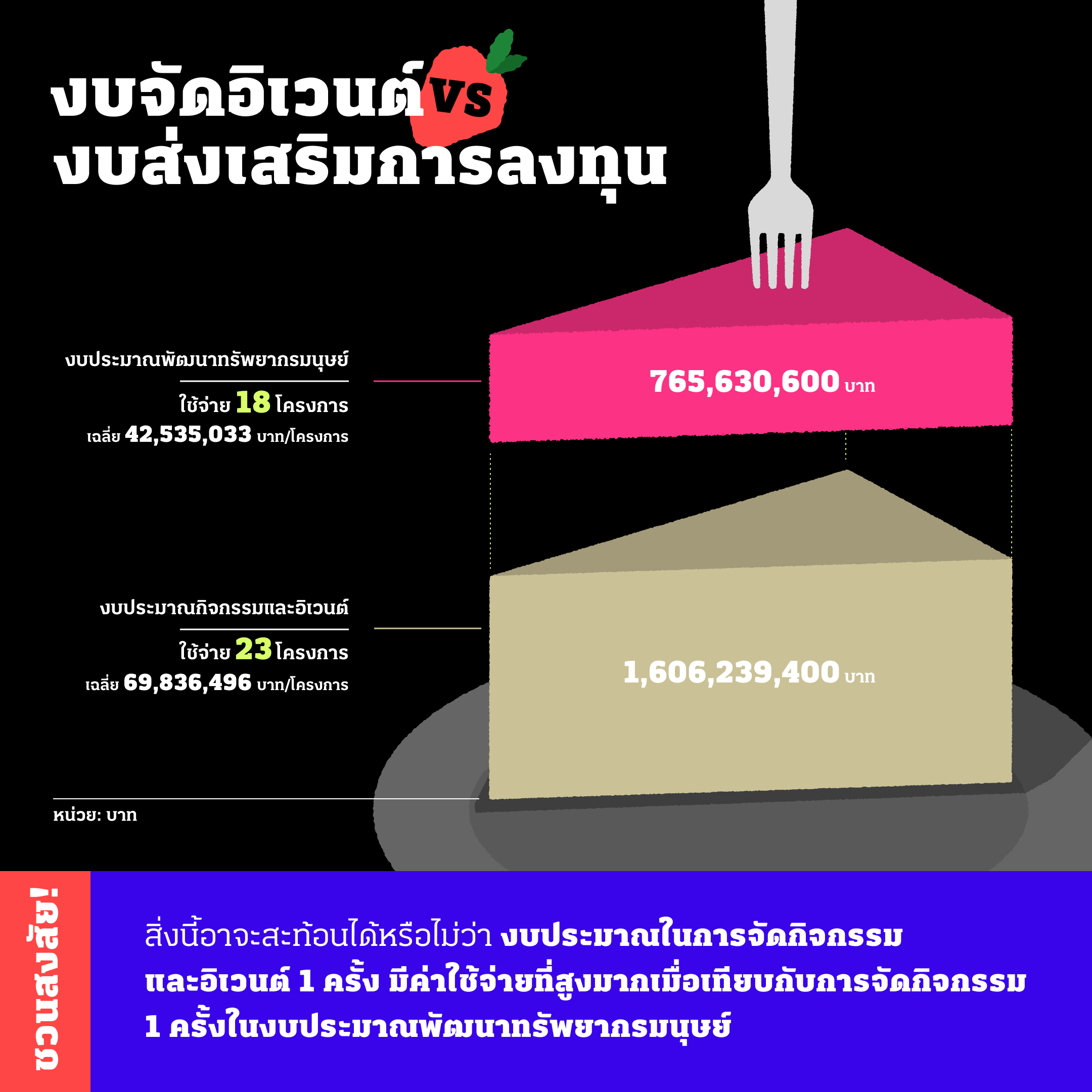 เมื่อค้นดูในรายละเอียดงบประมาณในการจัดกิจกรรมและอิเวนต์ จะพบว่าค่าใช้จ่ายโดยเฉลี่ยต่อการจัดกิจกรรมหรืออิเวนต์ 1 ครั้งจะอยู่ที่ 69.8 ล้านบาท ในขณะที่ค่าใช้จ่ายโดยเฉลี่ยต่อ 1 โครงการในส่วนของงบประมาณพัฒนาทรัพยากรมนุษย์จะอยู่ที่โครงการละ 42.5 ล้านบาท สิ่งนี้อาจะสะท้อนได้หรือไม่ว่า งบประมาณในการจัดกิจกรรมและอิเวนต์ 1 ครั้ง มีค่าใช้จ่ายที่สูงมากเมื่อเทียบกับการจัดกิจกรรม 1 ครั้งในงบประมาณพัฒนาทรัพยากรมนุษย์