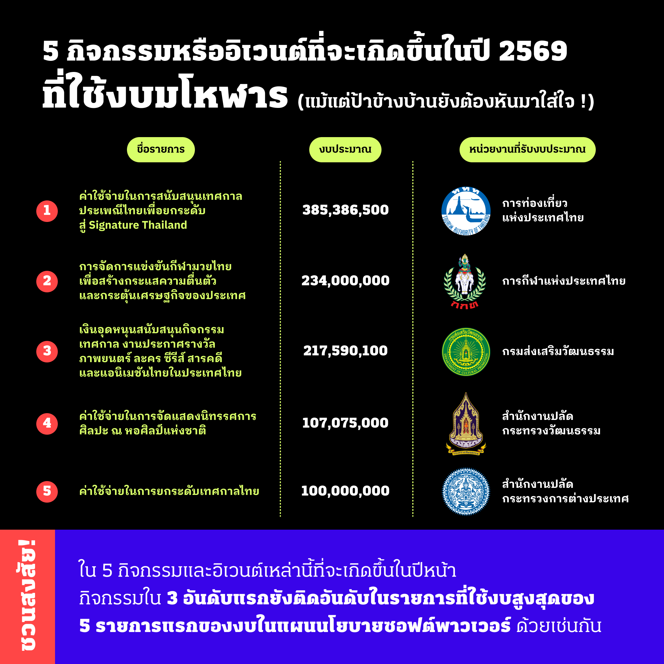 ใน 5 กิจกรรมและอิเวนต์เหล่านี้ที่จะเกิดขึ้นในปีหน้า กิจกรรมใน 3 อันดับแรกยังติดอันดับในรายการที่ใช้งบสูงสุด 5 รายการแรกของงบในแผนนโยบายซอฟต์พาวเวอร์ด้วยเช่นกัน