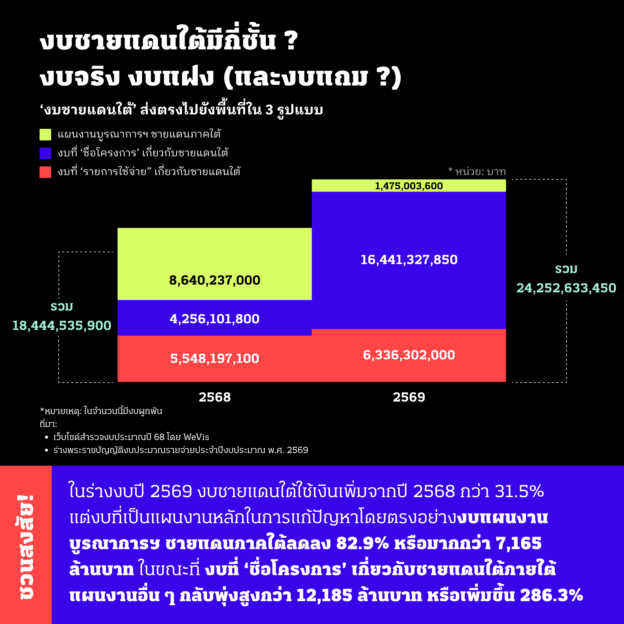 ในร่างงบประมาณปี 2569 งบชายแดนใต้จาก 3 แหล่งที่มาเพิ่มขึ้นจากปี 2568 กว่า 31.5% การใช้เงินที่เพิ่มขึ้นสะท้อนให้เห็นว่ารัฐบาลยังให้ความสำคัญกับเรื่องชายแดนใต้ อย่างไรก็ตาม ถ้ามองในสัดส่วนของแผนงานและชื่อรายการการใช้งบ จะพบว่างบที่เป็นแผนงานหลักในการแก้ปัญหาโดยตรงอย่างงบในแผนงานบูรณาการฯ ชายแดนภาคใต้ ลดลงจากปีก่อนหน้าเกือบ 6 เท่าตัว (ลดลง 82.9%) หรือมากกว่า 7,165 ล้านบาท ในขณะที่งบที่ ‘ชื่อโครงการ’ เกี่ยวกับชายแดนใต้ภายใต้แผนงานอื่น ๆ กลับพุ่งสูงอย่างน่าแปลกใจ โดยมีจำนวนเพิ่มขึ้น 12,185 ล้านบาท (เพิ่มขึ้น 286.3%)