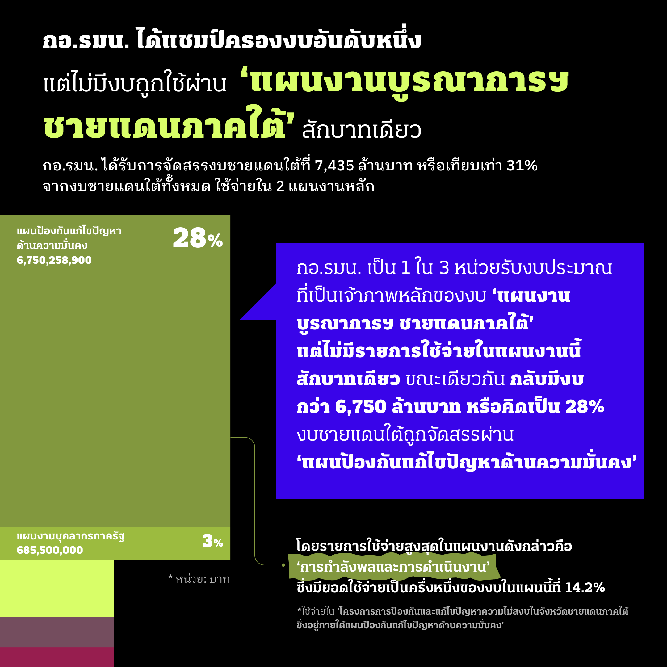 *รายการใช้จ่าย ‘การกำลังพลและการดำเนินงาน’ ใช้จ่ายใน ‘โครงการการป้องกันและแก้ไขปัญหาความไม่สงบในจังหวัดชายแดนภาคใต้ ซึ่งอยู่ภายใต้แผนป้องกันแก้ไขปัญหาด้านความมั่นคง’