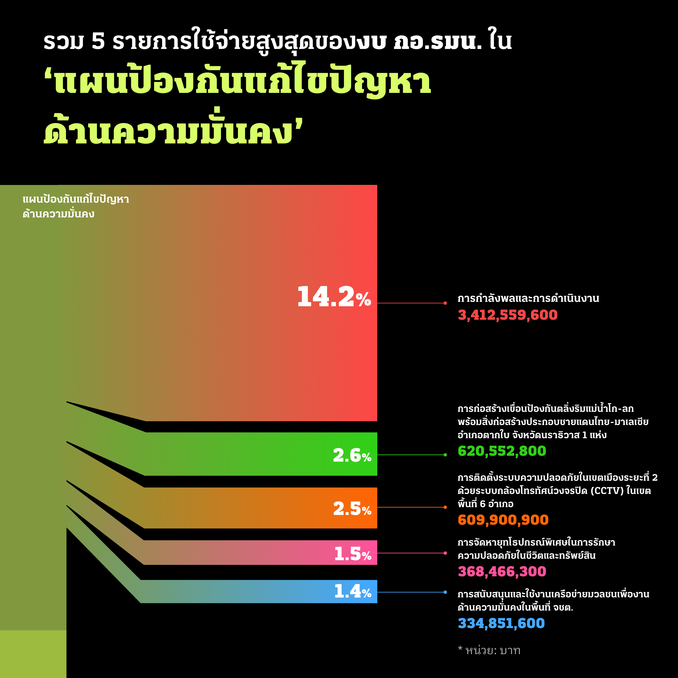 | 5 | การสนับสนุนและใช้งานเครือข่ายมวลชนเพื่องานด้านความมั่นคงในพื้นที่ จชต. | 1.4% | 334,851,600 |