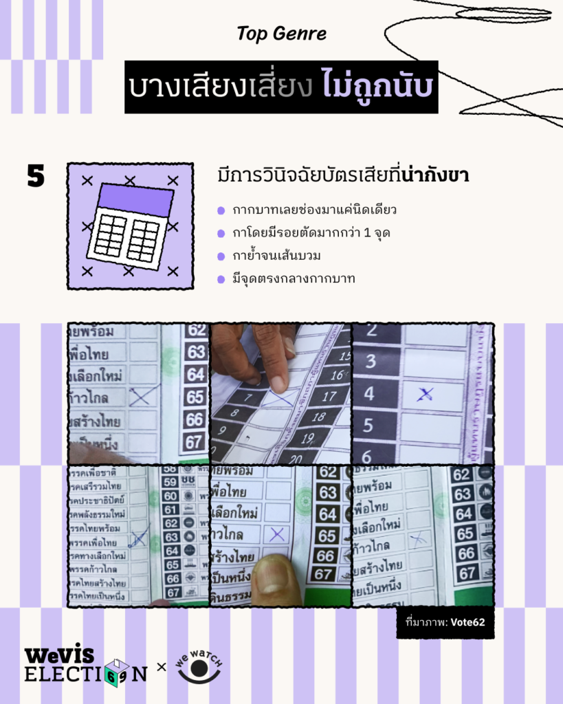 5. บัตรหลายใบถูกวินิจฉัยว่าเป็นบัตรเสียอย่างน่ากังขา เช่น
