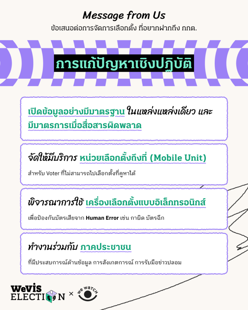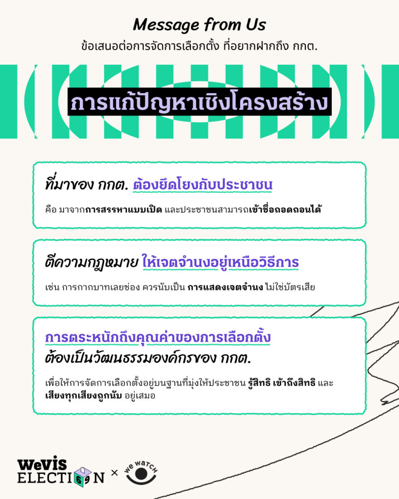 ดังนั้น เพื่อให้ประวัติศาสตร์ความผิดพลาดไม่ซ้ำรอย ไม่ว่าจะในการเลือกตั้งครั้งนี้หรือครั้งไหน การถอดรื้อทัศนคติ ‘การละเลยความสำคัญของสิทธิเลือกตั้ง’ ของ กกต. คือก้าวที่สำคัญที่สุด เราในฐานะภาคประชาสังคม จึงมีข้อเสนอต่อ กกต. ต่อการจัดการเลือกตั้ง ดังนี้