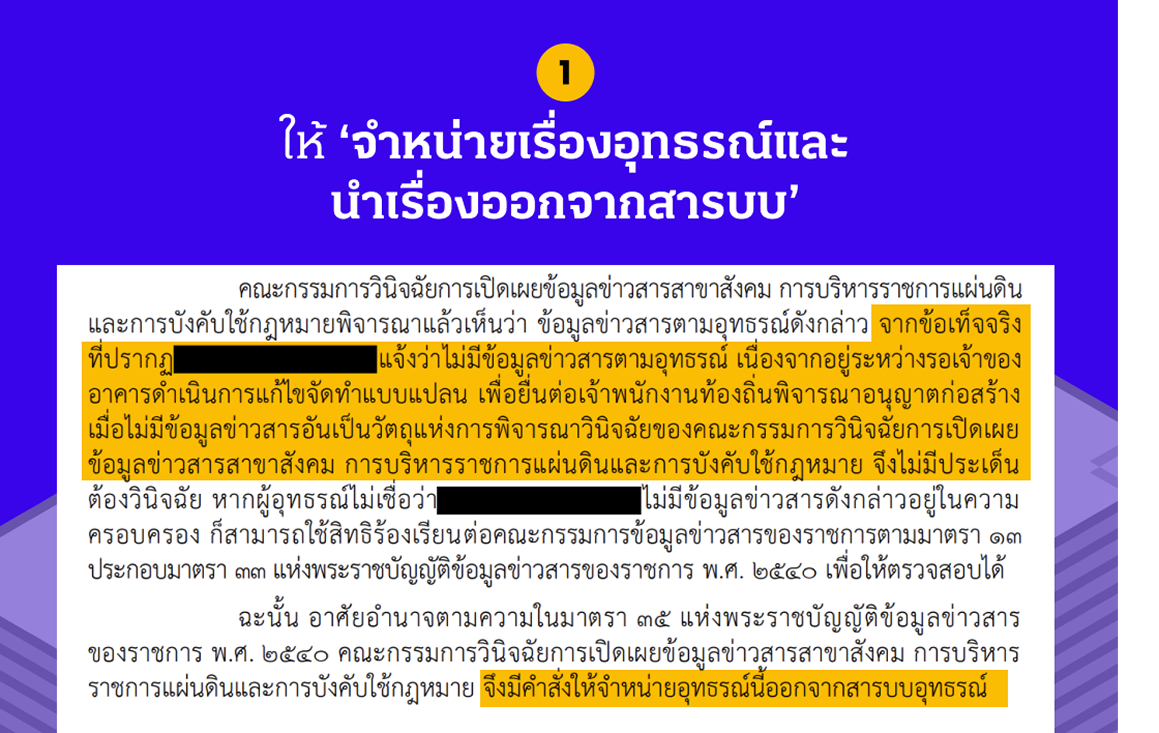 1. ให้ ‘จำหน่ายเรื่องอุทธรณ์และนำเรื่องออกจากสารบบ’: คำตัดสินประเภทนี้ไม่ได้เป็นการบอกว่าใครถูกใครผิดในเนื้อหาของเรื่อง แต่เป็นการ “ยุติการพิจารณา” เรื่องนั้น ๆ โดยที่ กวฉ. ไม่ได้ตัดสินว่าจะต้องเปิดเผยหรือไม่เปิดเผยข้อมูลนั้น เหตุผลอาจมีหลายอย่าง เช่น หน่วยงานไม่ได้เป็นเจ้าของข้อมูล ผู้ขอข้อมูลอาจจะถอนคำร้องไปเอง หน่วยงานอาจจะยอมให้ข้อมูลแล้วในภายหลัง หรือเอกสารคำร้องไม่สมบูรณ์ ทำให้เรื่องไม่สามารถเดินหน้าต่อไปได้