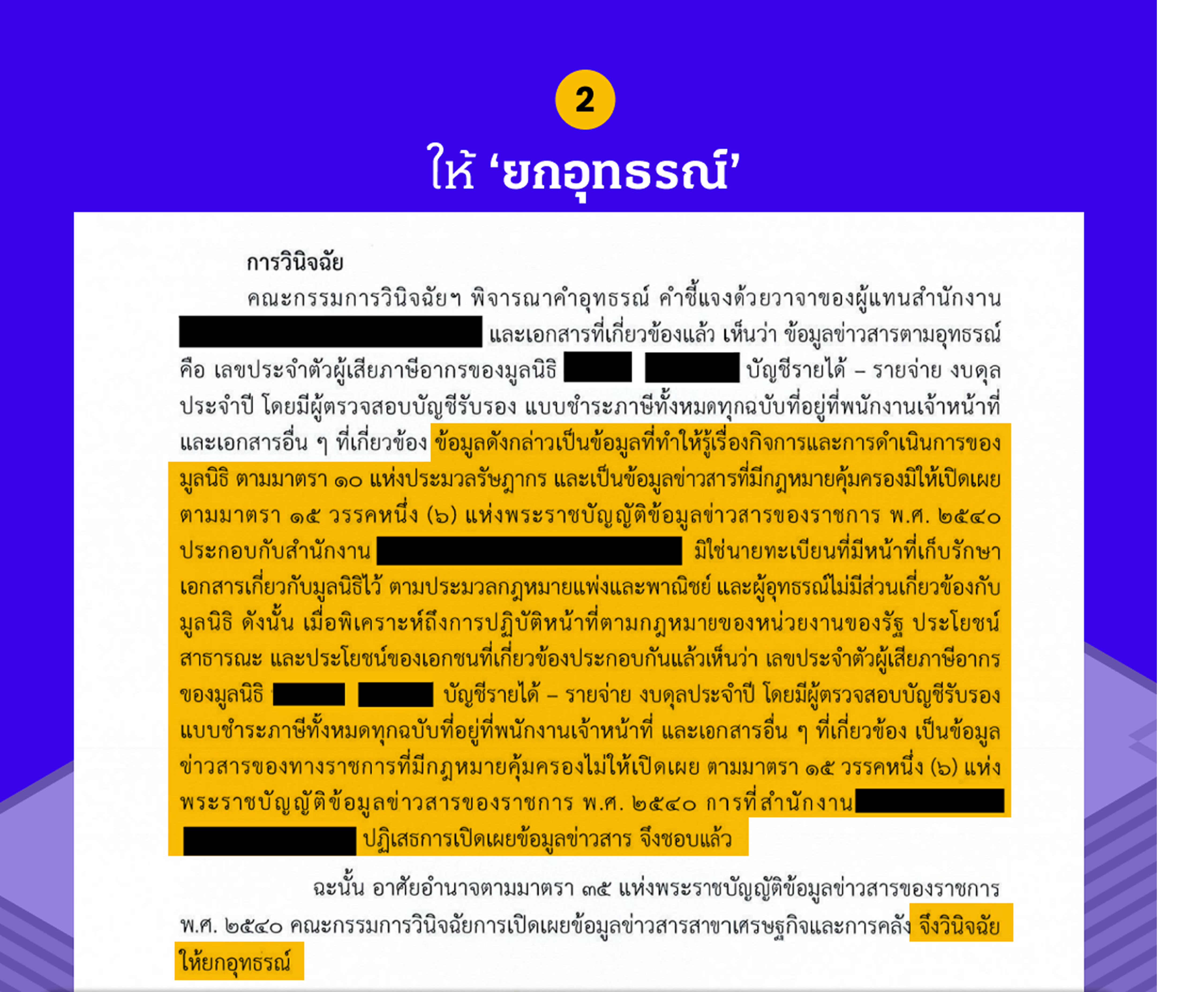 2. ให้ ‘ยกอุทธรณ์’: นี่คือคำตัดสินที่บอกว่า “ไม่เป็นไปตามคำขอ” พูดง่าย ๆ คือ คณะกรรมการ กวฉ. พิจารณาแล้ว เห็นด้วยกับการตัดสินใจของหน่วยงานรัฐ ที่ไม่ยอมเปิดเผยข้อมูลนั้น ๆ หมายความว่าข้อมูลที่ประชาชนขออาจยังคงเป็นความลับต่อไป ด้วยเหตุผลที่หน่วยงานและ กวฉ. มองว่าสมเหตุสมผลตามกฎหมาย เช่น อาจเป็นข้อมูลที่กระทบความมั่นคง ข้อมูลส่วนบุคคล ความลับทางราชการ หรือกระบวนทางกฎหมายยังไม่แล้วเสร็จ