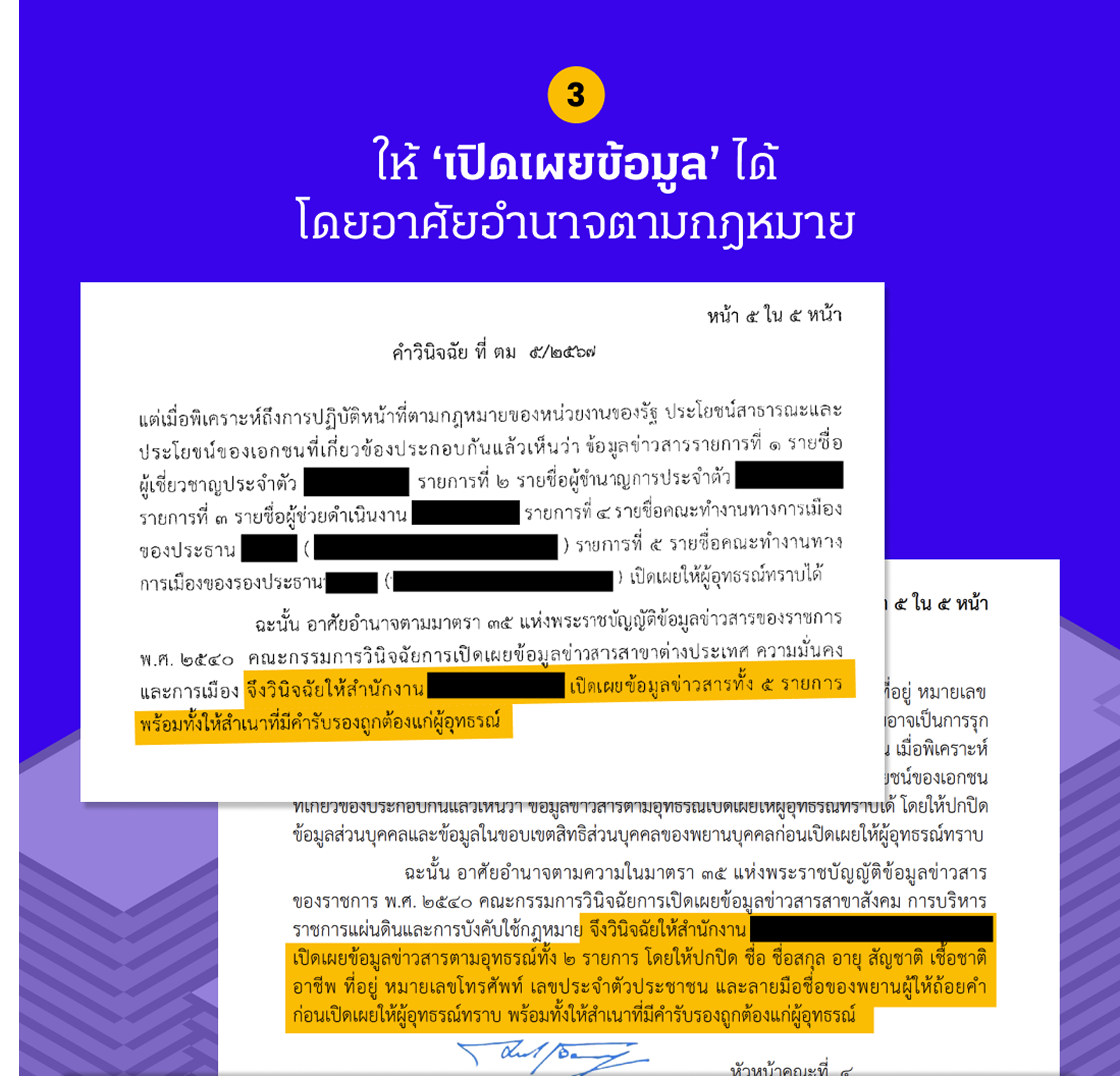 3. ให้ ‘เปิดเผยข้อมูล’ ได้ โดยอาศัยอำนาจตามกฎหมาย: หลาย ๆ เรื่องจากทั้งหมดส่วนใหญ่ผลมักออกมาเป็นการวินิจฉัยให้เปิดเผยข้อมูลข่าวสารดังกล่าวได้ แต่อาจจะขอร้องให้หน่วยงานช่วยปกปิดข้อมูลในประเด็นเรื่องข้อมูลส่วนบุคคลของผู้เกี่ยวข้อง เพราะอาจกระทบกับกฎหมาย PDPA