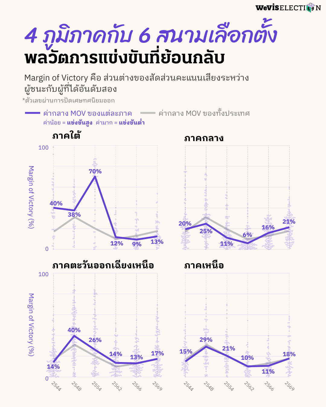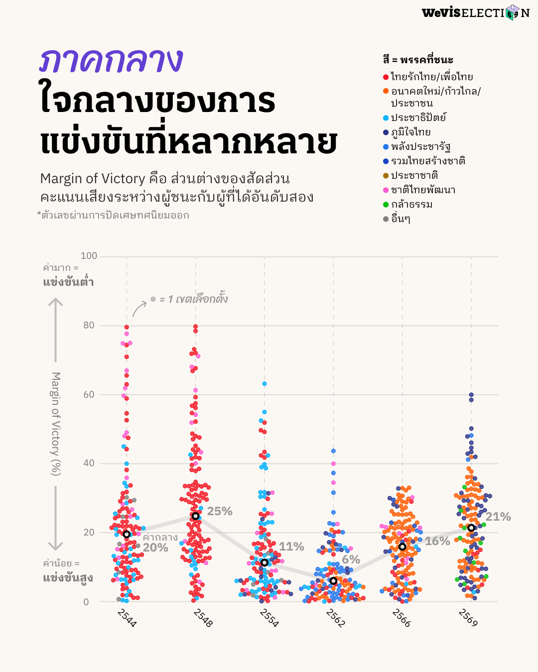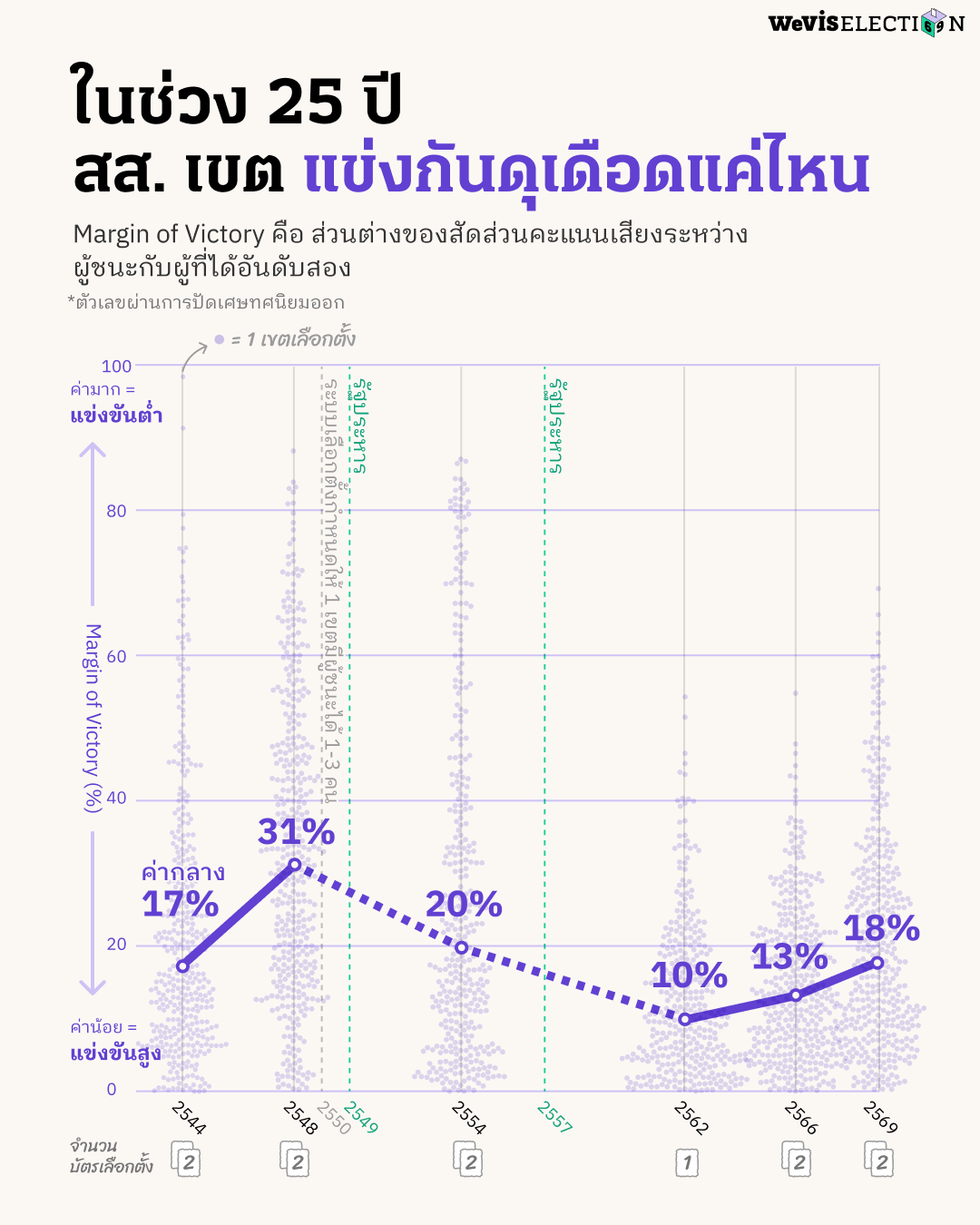 บทความชิ้นนี้วิเคราะห์การแข่งขันภายในเขตเลือกตั้งผ่านการคำนวณหาค่า Margin of Victory (MOV) โดยปัดเศษทศนิยมออก จากผลการเลือกตั้งในปี 2544, 2548, 2554, 2562, 2566, และ 2569 โดยละเว้นการวิเคราะห์ข้อมูลผลการเลือกตั้งปี 2550 เนื่องด้วยในการเลือกตั้งครั้งดังกล่าวได้เพิ่มการออกเสียงให้ประชาชนสามารถเลือก สส. เขต ได้ระหว่าง 1-3 คนต่อเขต เพื่อกระจายคะแนนไปยังผู้สมัครหลายคน ทำให้การเลือกตั้ง สส. เขตมีจำนวน สส. ที่ชนะการเลือกตั้งในแต่ละเขตที่ไม่เท่ากัน เช่น ในเขตที่ต้องเลือก สส. 3 คน จะมีผู้ชนะเลือกตั้งทั้งหมด 3 คนคือคนที่ได้คะแนนเสียงสูงสุดใน 3 อันดับแรก ระบบการเลือกตั้งนี้จึงไม่สามารถใช้วิธีการคำนวณ MOV เหมือนการเลือกตั้งในครั้งอื่น ๆ ได้