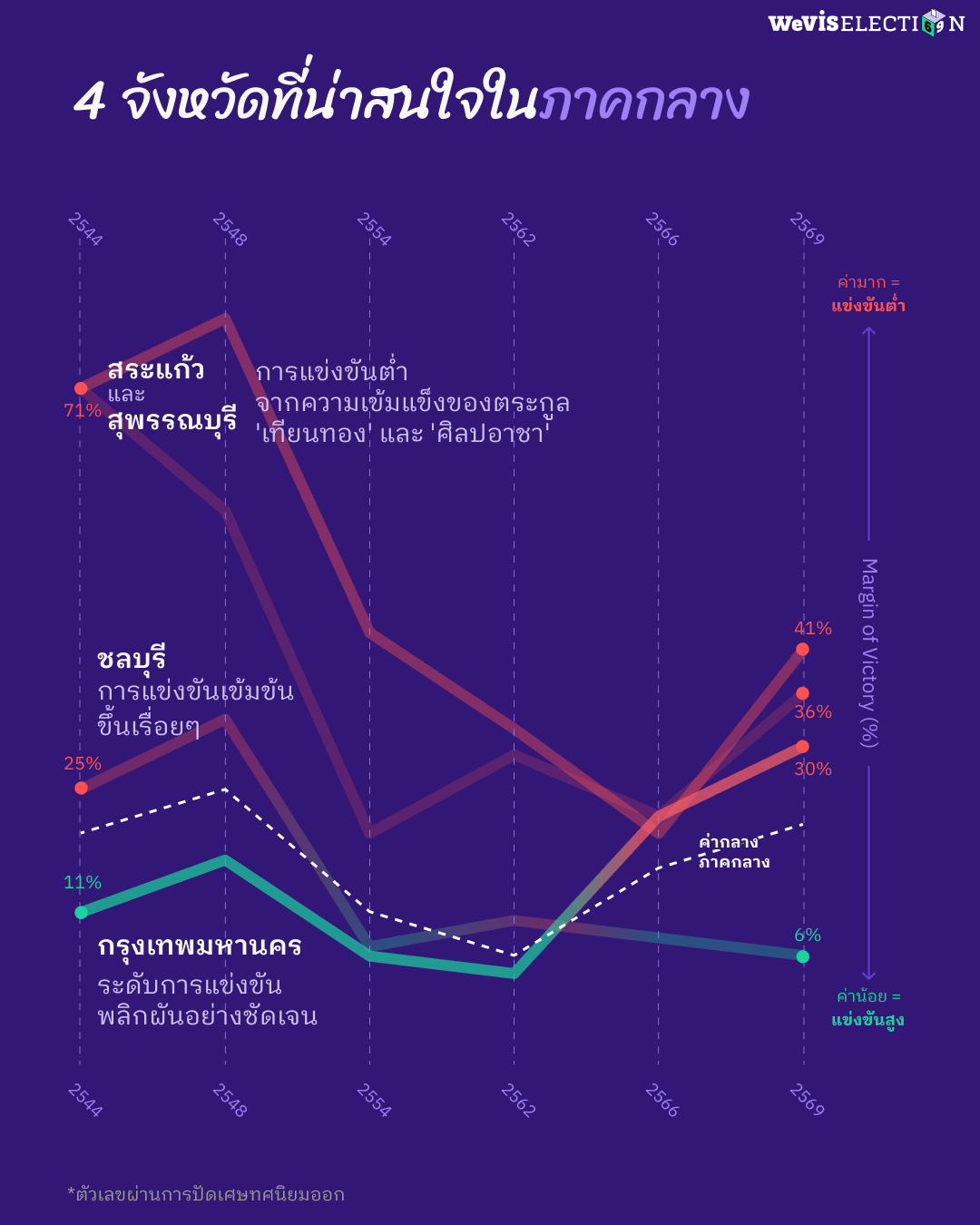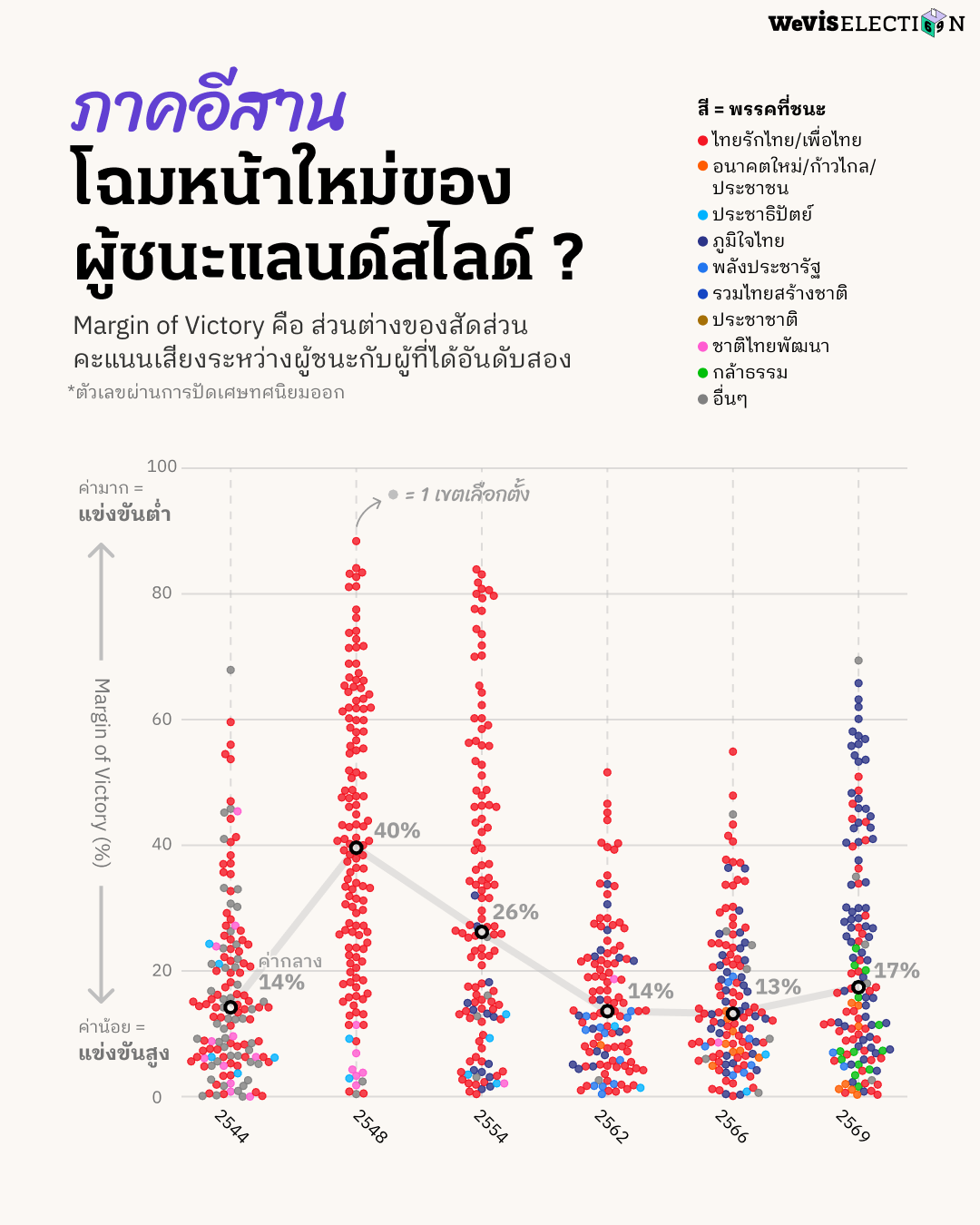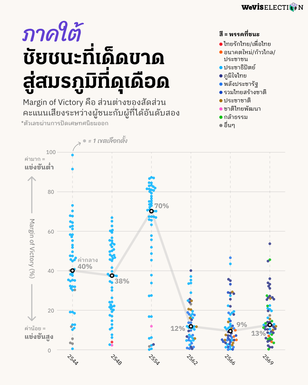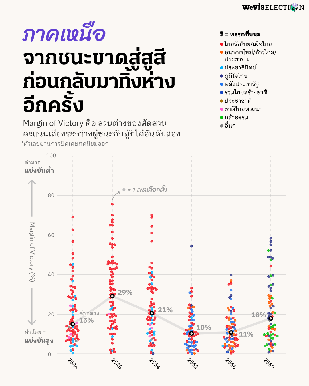 บทความชิ้นนี้วิเคราะห์การแข่งขันภายในเขตเลือกตั้งผ่านการคำนวณหาค่า Margin of Victory (MOV) โดยปัดเศษทศนิยมออก จากผลการเลือกตั้งในปี 2544, 2548, 2554, 2562, 2566, และ 2569 โดยละเว้นการวิเคราะห์ข้อมูลผลการเลือกตั้งปี 2550 เนื่องด้วยในการเลือกตั้งครั้งดังกล่าวได้เพิ่มการออกเสียงให้ประชาชนสามารถเลือก สส. เขต ได้ระหว่าง 1-3 คนต่อเขต เพื่อกระจายคะแนนไปยังผู้สมัครหลายคน ทำให้การเลือกตั้ง สส. เขตมีจำนวน สส. ที่ชนะการเลือกตั้งในแต่ละเขตที่ไม่เท่ากัน เช่น ในเขตที่ต้องเลือก สส. 3 คน จะมีผู้ชนะเลือกตั้งทั้งหมด 3 คนคือคนที่ได้คะแนนเสียงสูงสุดใน 3 อันดับแรก ระบบการเลือกตั้งนี้จึงไม่สามารถใช้วิธีการคำนวณ MOV เหมือนการเลือกตั้งในครั้งอื่น ๆ ได้