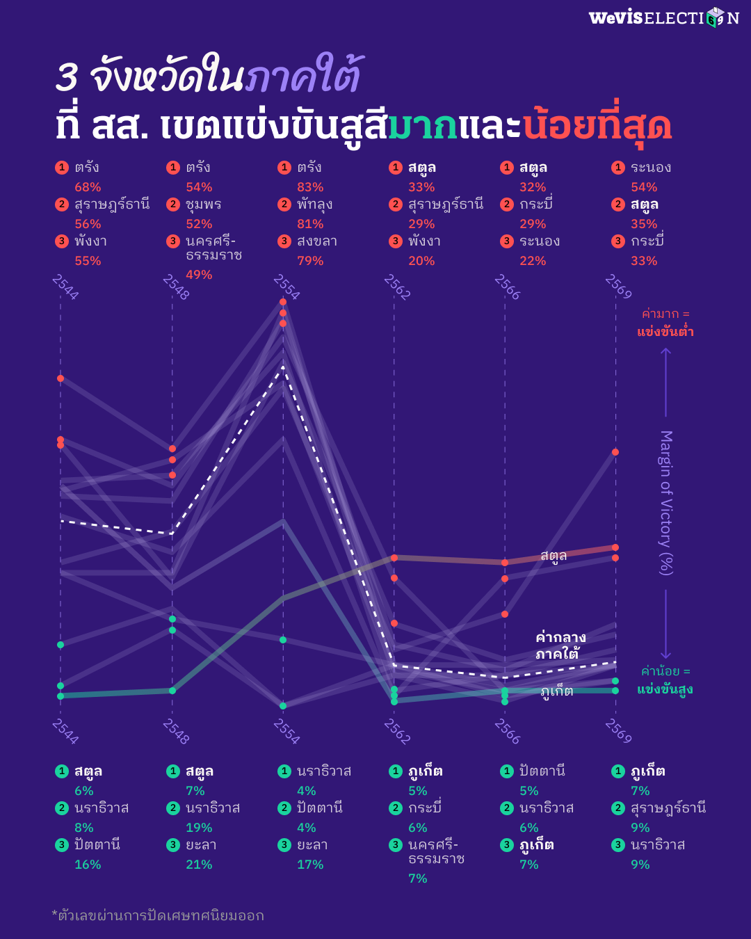 สตูลเป็นจังหวัดที่ความสูสีในการแข่งขัน สส. เขต ลดน้อยลงเรื่อย ๆ จากพื้นที่ที่มีการแข่งขันสูงในปี 2544 (ค่ากลาง MOV 6) กลายเป็นพื้นที่ที่การแข่งขันต่ำมากเป็นอันดับสองในการเลือกตั้งปี 2569 ซึ่งตรงกันข้ามกับภูเก็ตที่ขยับตัวจากพื้นที่ที่มีค่า MOV สูงในการเลือกตั้งปี 2554 (ค่ากลาง MOV 40) ซึ่งสะท้อนการแข่งขันที่ไร้ความดุเดือดสู่พื้นที่ที่ สส. เขต แข่งขันกันอย่างสูสีมากที่สุดในการเลือกตั้งปี 2569 (ค่ากลาง MOV 7) พลวัตการแข่งขัน สส. เขตในภาคใต้ สะท้อนให้เห็นว่าเป็นภูมิภาคที่พรรคการเมืองสามารถกอบโกยผลชัยชนะที่เด็ดขาดได้ อีกทั้งสามารถสูญเสียความนิยมจนนำไปสู่สมรภูมิที่ดุเดือดได้เช่นกัน อย่างไรก็ดี ข้อมูลยังชี้ให้เห็นว่า พื้นที่ 3 จังหวัดชายแดนใต้ (ปัตตานี ยะลา และนราธิวาส) มีการแข่งขัน สส. เขตในระดับสูสีในลำดับต้น ๆ ของภูมิภาคมาโดยเสมอ โดยเฉพาะอย่างยิ่งหลังจากการเลือกตั้งในปี 2562 เป็นต้นมา ซึ่งสะท้อนว่าเป็นพื้นที่ที่ไม่มีใครผูกขาดคะแนนเสียงได้มาโดยตลอด