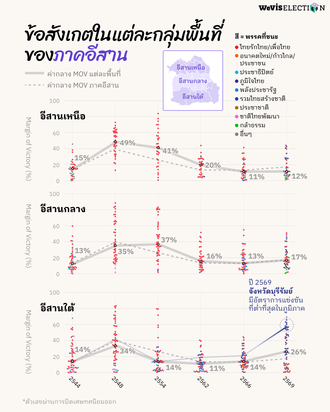 - ในการเลือกตั้งปี 2569 พื้นที่อีสานใต้มีการอัตราการแข่งขันที่ต่ำที่สุดในภูมิภาค โดยเฉพาะบุรีรัมย์ ค่ากลาง MOV ของจังหวัดที่ 57 ซึ่งเป็นการแข่งขันที่ชนะกันทิ้งห่างมากที่สุดในประวัติศาสตร์ของจังหวัดตั้งแต่ปี 2548 เป็นต้นมา สะท้อนความเข้มแข็งของตระกูลชิดชอบแห่งพรรคภูมิใจไทยในจังหวัดบุรีรัมย์ที่ก้าวขึ้นสู่จุดสูงสุด โดยค่ากลาง MOV ของจังหวัดเพิ่มขึ้นอย่างก้าวกระโดดจากการเลือกตั้ง 2562 ที่ 19 และ 2566 ที่ 21