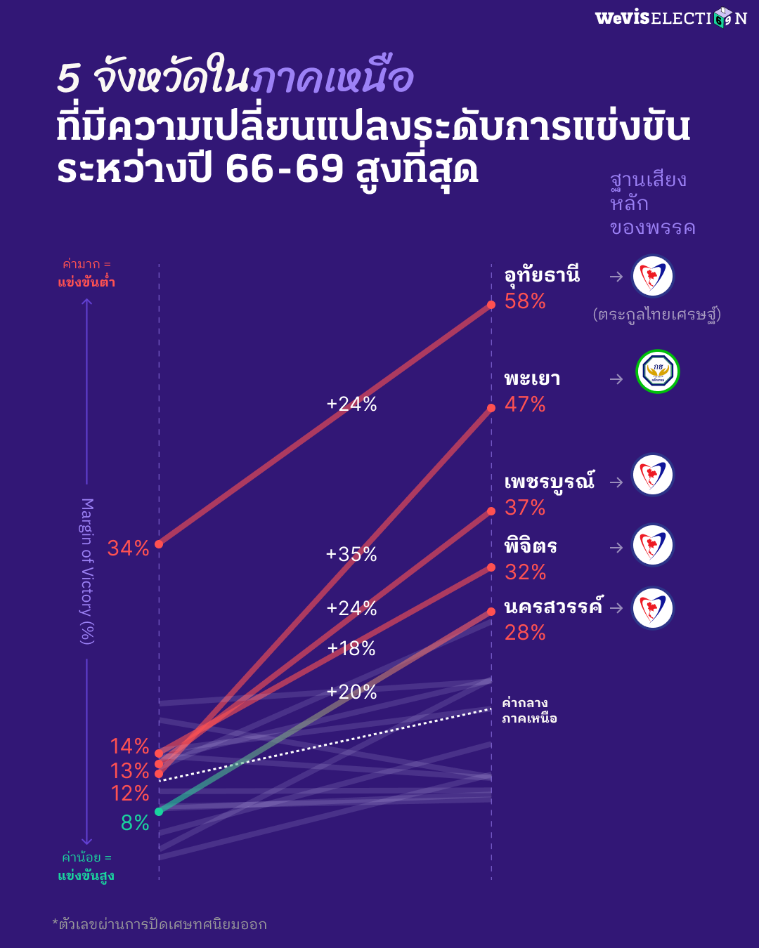 ข้อสังเกตในกรณี 5 จังหวัดแรกที่มีการเปลี่ยนแปลงของส่วนต่างคะแนนของผู้ชนะอันดับหนึ่งและสองมากที่สุด เป็นจังหวัดที่เป็นฐานเสียงหลักของพรรคกล้าธรรม (พะเยา) และพรรคภูมิใจไทย (เพชรบูรณ์ อุทัยธานี นครสวรรค์ และพิจิตร ซึ่งทั้งหมดอยู่ในโซนภาคเหนือตอนล่าง) สะท้อนความเข้มแข็งของฐานเสียงในพื้นที่ของผู้สมัครทั้ง 2 พรรค ซึ่งมีทั้งผู้สมัครหน้าเดิมในพรรคเดิม (เช่น ตระกูลไทยเศรษฐ์ พรรคภูมิใจไทย ในจังหวัดอุทัยธานี) และผู้สมัครที่ย้ายมาจากพรรคการเมืองอื่น ได้แก่