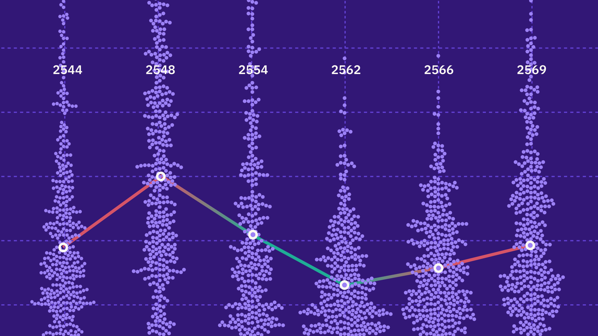 ภาพรวมของการแข่งขัน สส. เขต ในการเลือกตั้ง 6 ครั้งระหว่างปี 2544 ถึง 2569 ปรากฏให้เห็นระดับการแข่งขันที่แตกต่างกันจากทิศทางการกระจุกตัวของค่า MOV ในแต่ละเขตเลือกตั้ง และ ‘ค่ากลาง MOV’* หรือค่ามัธยฐานในการเลือกตั้งแต่ละครั้ง