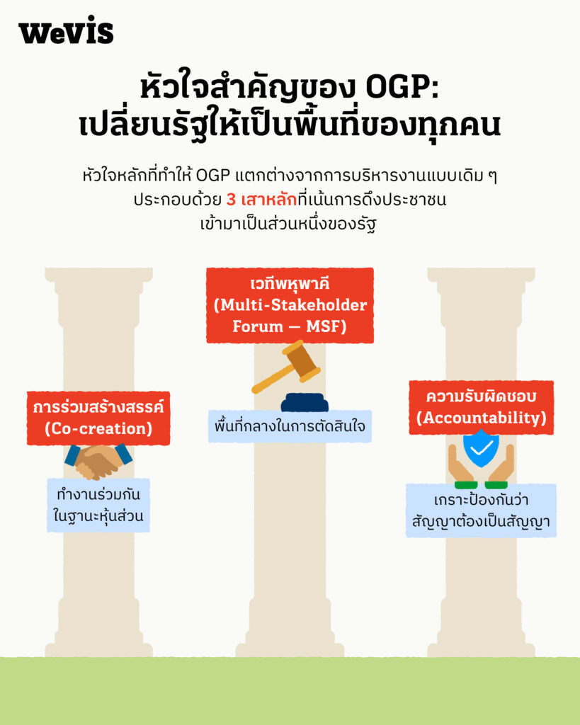 หัวใจหลักที่ทำให้ OGP แตกต่างจากการบริหารงานแบบเดิม ๆ ประกอบด้วย 3 เสาหลักที่เน้นการดึงประชาชนเข้ามาเป็นส่วนหนึ่งของรัฐ: