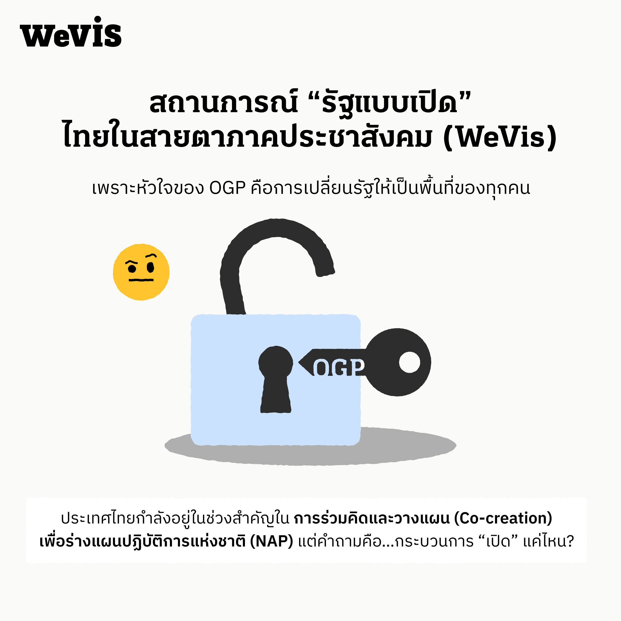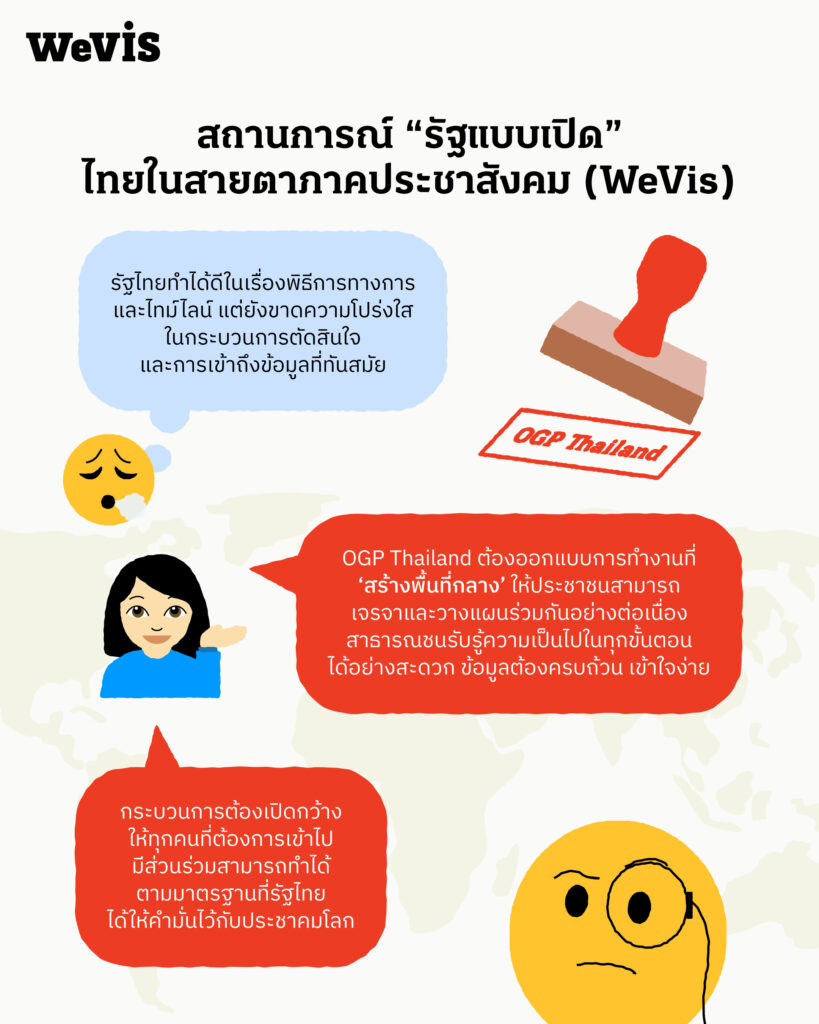 WeVis ที่มุ่งมั่นขับเคลื่อนเรื่องรัฐแบบเปิด (Open Government) มาอย่างต่อเนื่อง ได้พยายามติดตามการทำงานของ ก.พ.ร. ในฐานะเจ้าภาพ OGP Thailand อย่างใกล้ชิด และได้พูดคุยกับผู้มีส่วนเกี่ยวข้องทั้งในและต่างประเทศ ในฐานะหนึ่งในภาคประชาสังคมที่ต้องการมีส่วนร่วมในกระบวนการ ขอแสดงความกังวลในกระบวนการของ OGP Thailand ดังต่อไปนี้