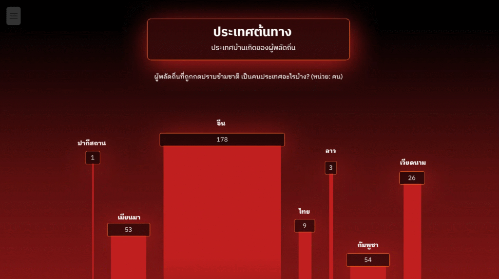 จากข้อมูลนี้ แสดงให้เห็นว่า เหยื่อของการกดปราบมากถึง 178 คน มี ประเทศต้นทาง คือ จีน ตามมาด้วยกัมพูชาและเมียนมา